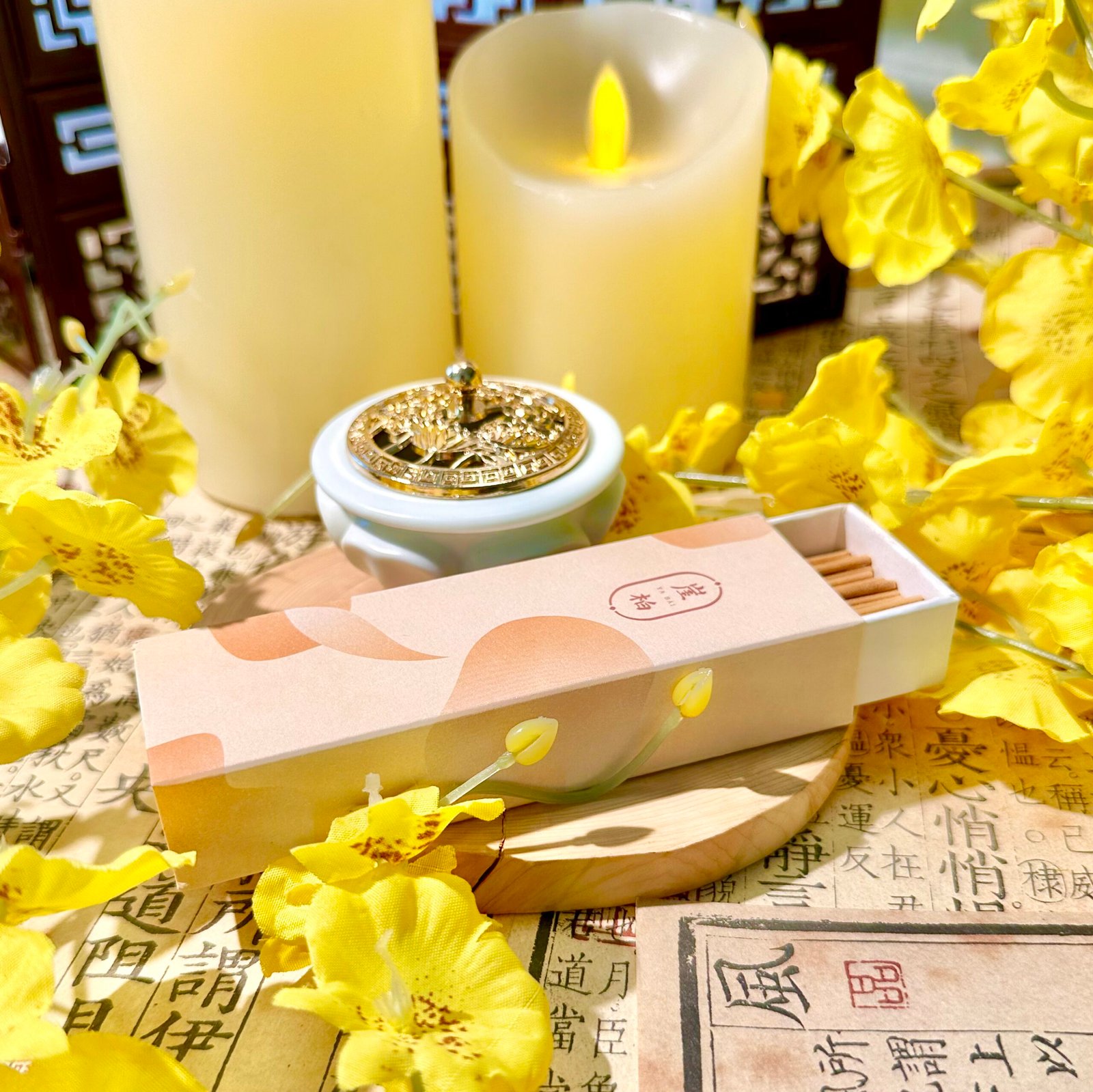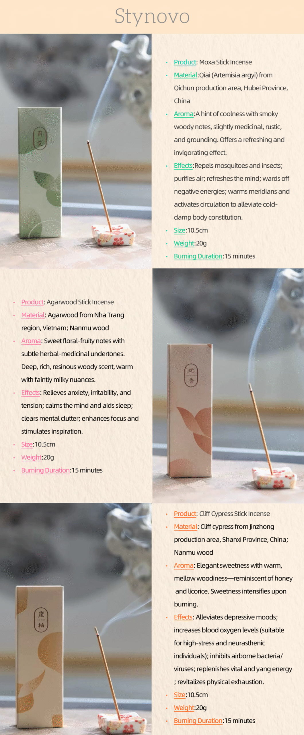 Artemisia argyi incense (Green), Agarwood incense (Red), Cliff Cypress incense (Orange)